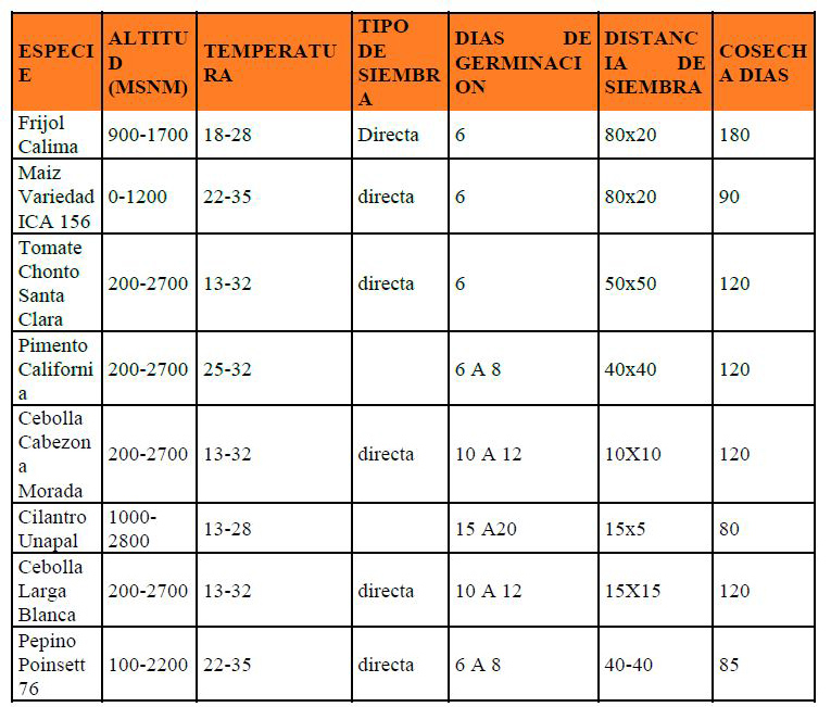 Para alcanzar el objetivo 1: “ Se Diseñó un modelo eficiente de huerta casera para 150 familias orientada a la línea productiva coherente a la dieta de las familias” se identificó un área de 100 metros cuadrados aproximadamente, dentro de esta área para huerta casera, se implementaran las especies que tradicionalmente han sido usadas por las familias de la zona, una vez seleccionada la especie a sembrar se verificaron aspectos como la altitud, temperatura para su desarrollo, tipo de siembra el cual puede ser directa o indirecta, días de germinación distancia a sembrar y días de cosecha, lo anteriormente expuesto se muestra en el siguiente cuadro.