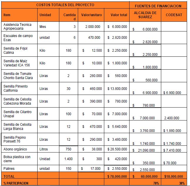 El municipio de Suarez en el Departamento del cauca, identifico dentro de sus necesidades plasmadas en el Plan de Desarrollo 2020 – 2023 “por un Suarez incluyente, emprendedor, sostenible y en paz”, buscar acciones encaminadas a fortalecer el empleo y la seguridad alimentaria de sus habitantes, dentro de sus estrategias firmo un convenio de asociación, bajo la modalidad de selección directa por la idoneidad de CODESAT, una organización líder en este tipo de iniciativas y proyectos que propenden un bienestar integral a la comunidad. El 2 de diciembre del año 2020, se inició con el acompañamiento de la oficina de la Unidad de producción Agropecuaria y Desarrollo Económico UPADEC, el proyecto denominado “Instalación de 150 huertas caseras para el fortalecimiento de la seguridad alimentaria de las familias más vulnerables del municipio de Suarez – Cauca y contribuir con el mejoramiento de los ingresos económicos familias”.